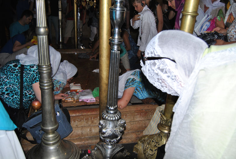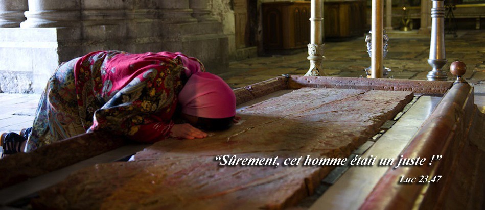 Pierre de l'onction ou fut déposé le corps de Jésus .Des Femmes prient en silence .