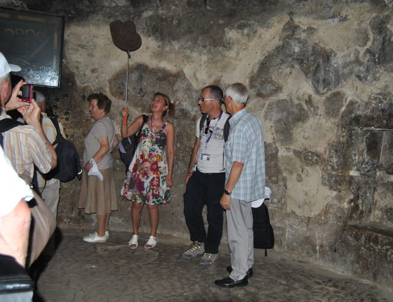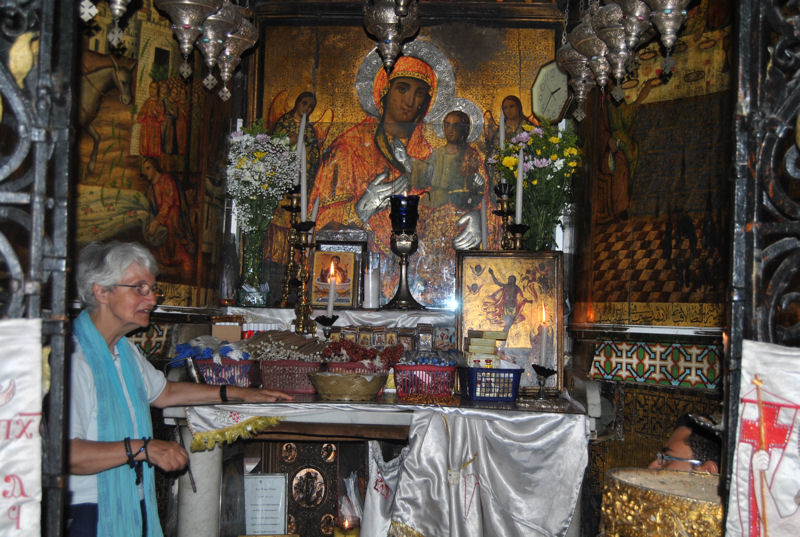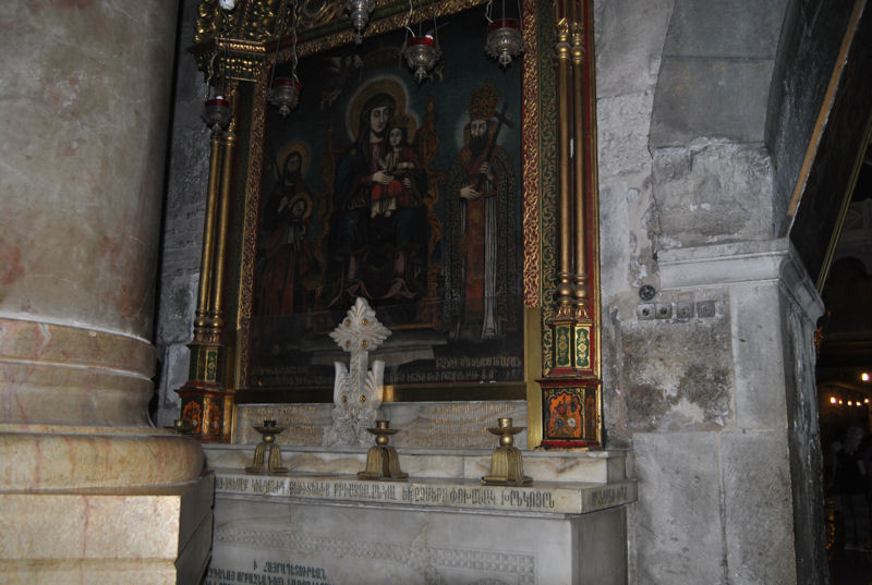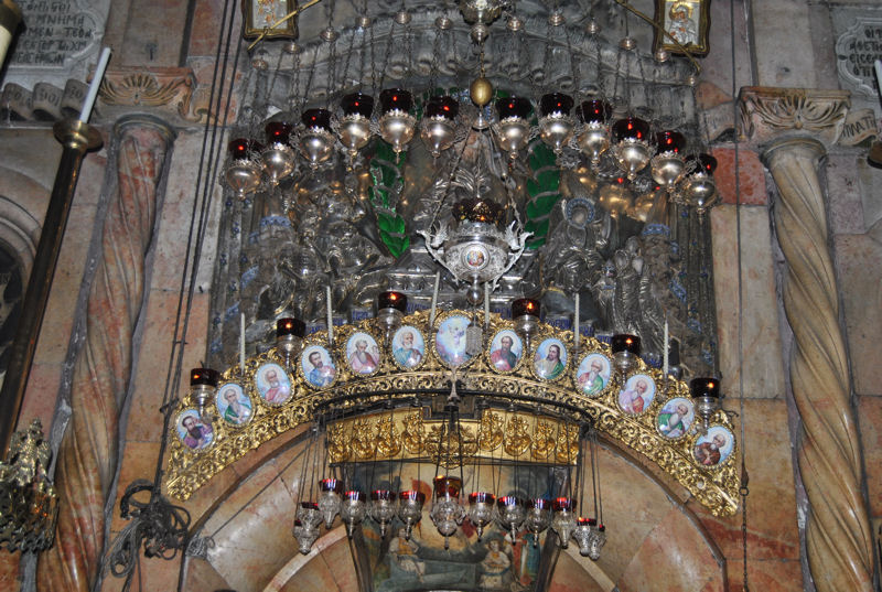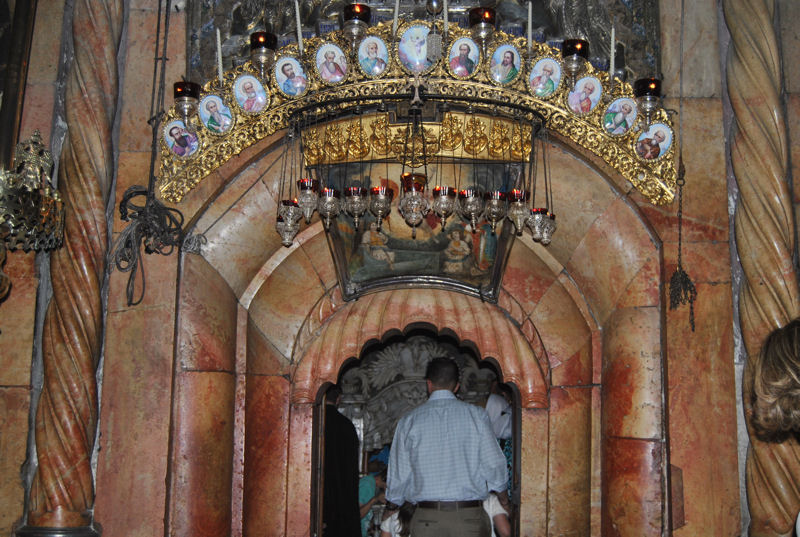 JERUSALEM ( suite ) Photo prise de près afin de voir les moindres détails. .Entrée du tombeau du Christ par la Chapelle de l’ange avec au centre la pierre sur laquelle l’ange était assis. Petit autel avec une gentille dame très dévouée.« ! ».